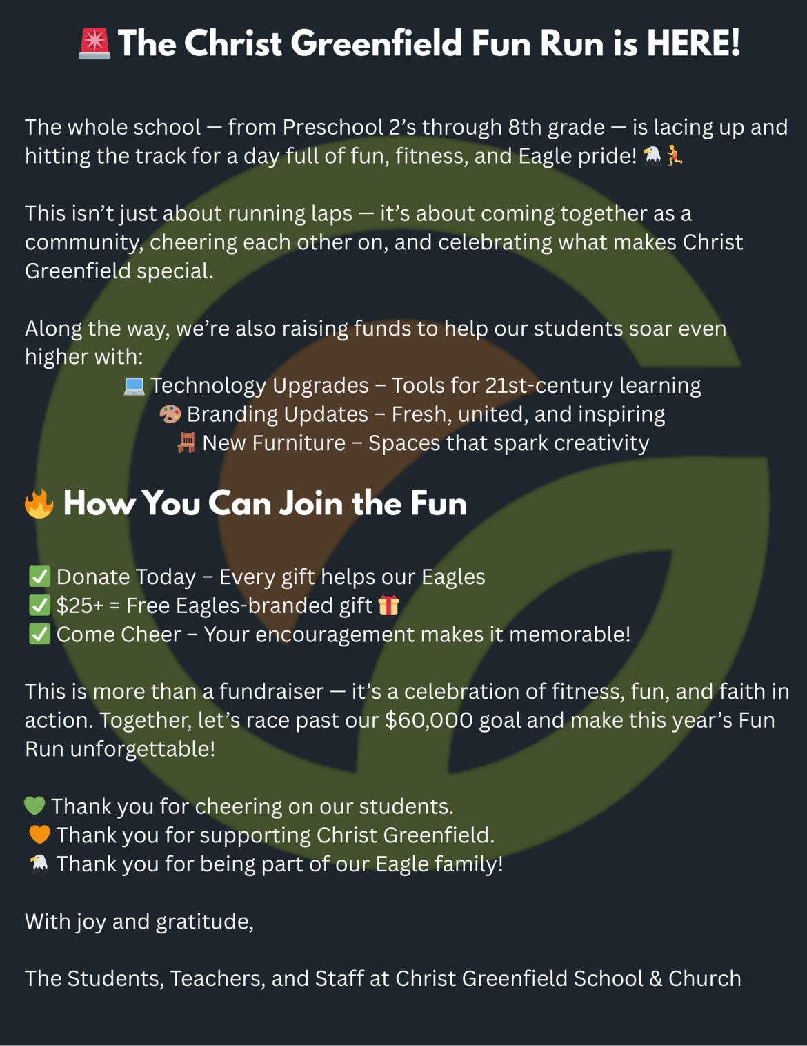 Put Your Eagle Pride on Display! Donate $25 and we’ll send you a custom Christ Greenfield School decal — perfect for water bottles, laptops, cars, or lockers.
